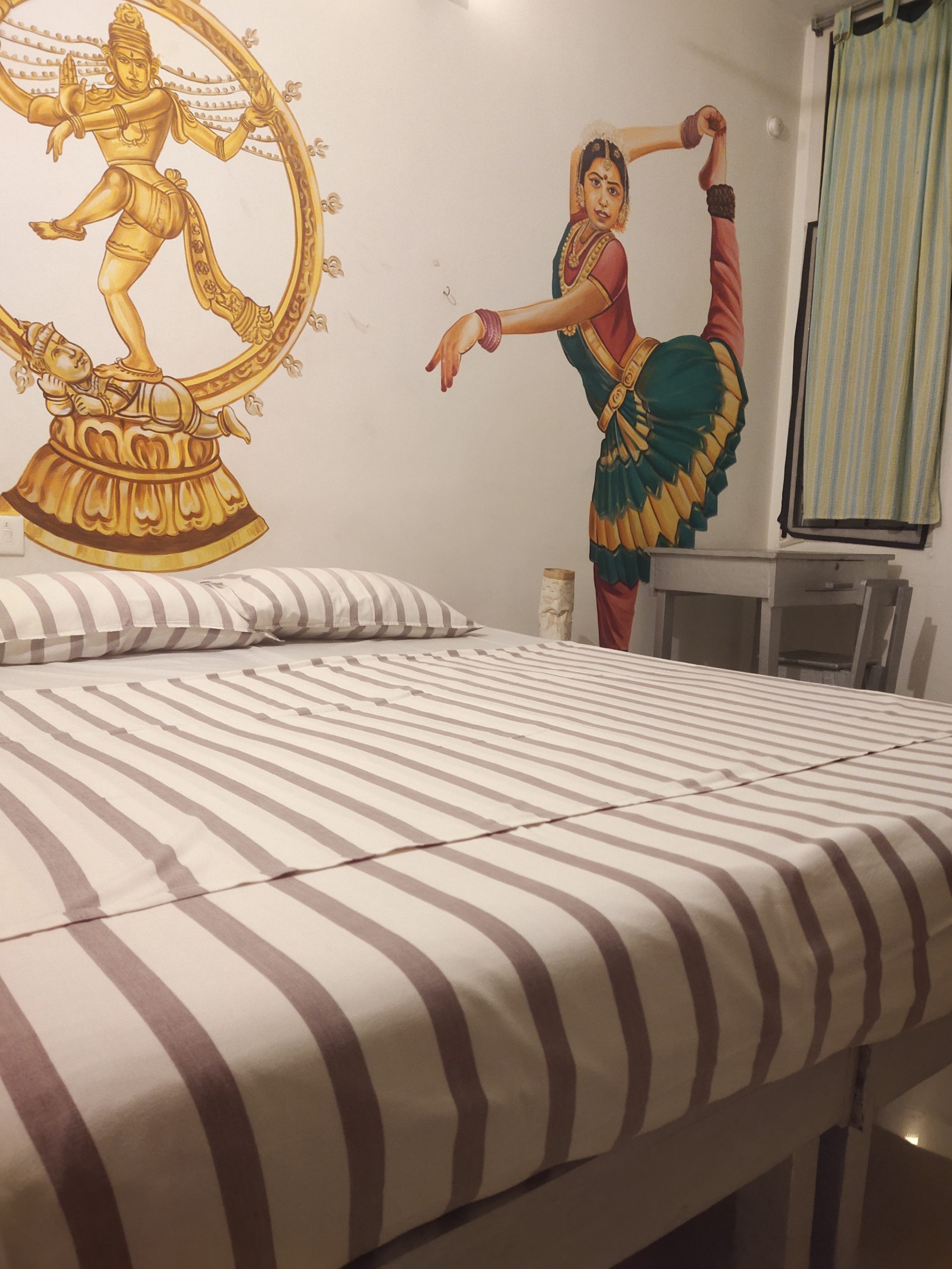 This room is situated on the first floor, conveniently near a charming swinging chair, perfect for relaxation. Adorning the wall is a captivating painting that depicts the traditional Tamil Nadu dance known as Bharatanatyam. The artwork beautifully illustrates a graceful girl dancing in front of Lord Nataraja, a revered deity in Indian culture. Surrounding her are intricate representations of various mudras, the hand gestures that are essential to the Bharatanatyam performance.