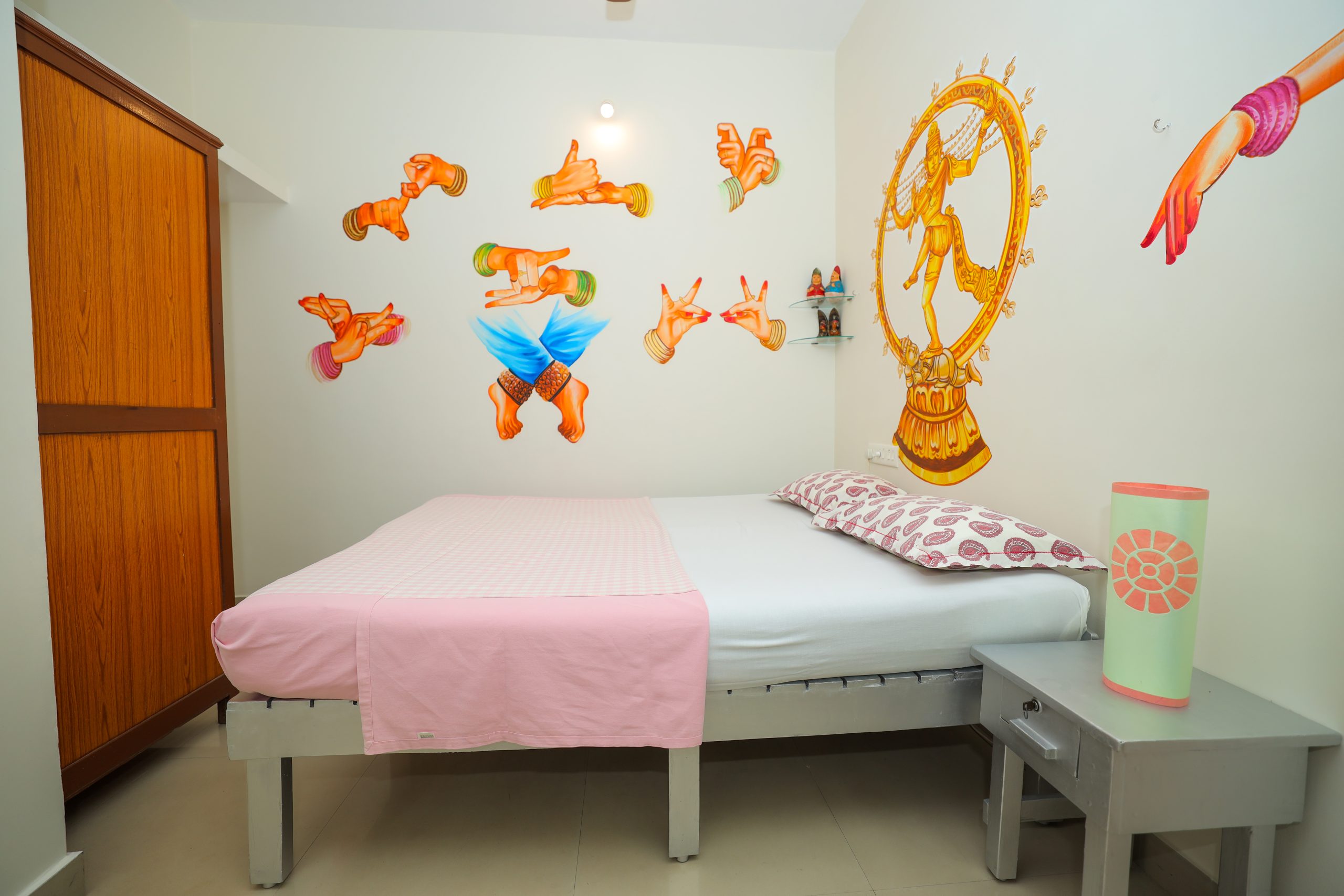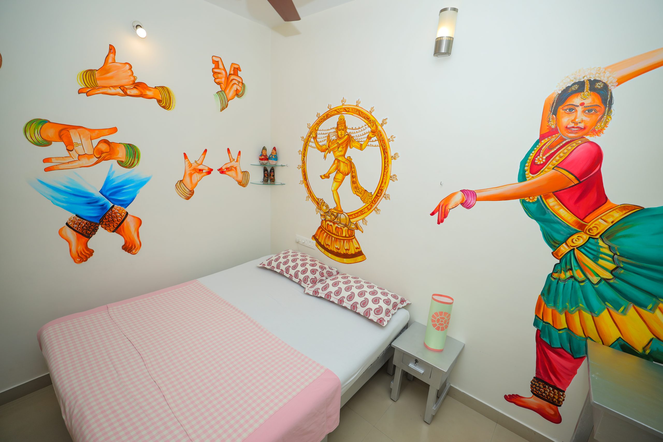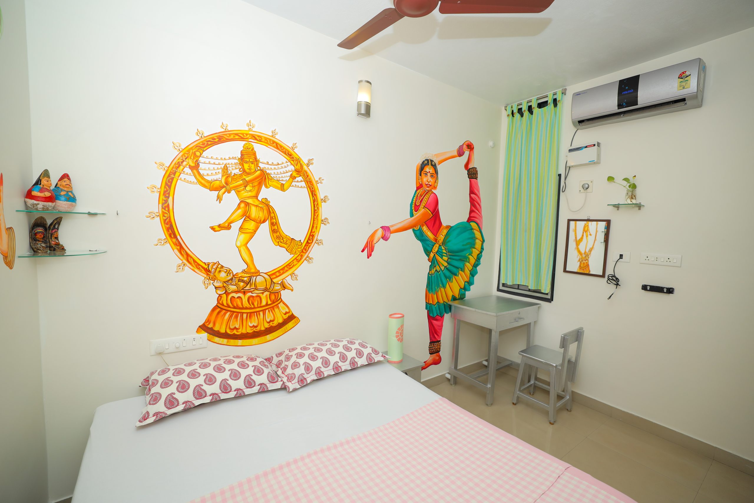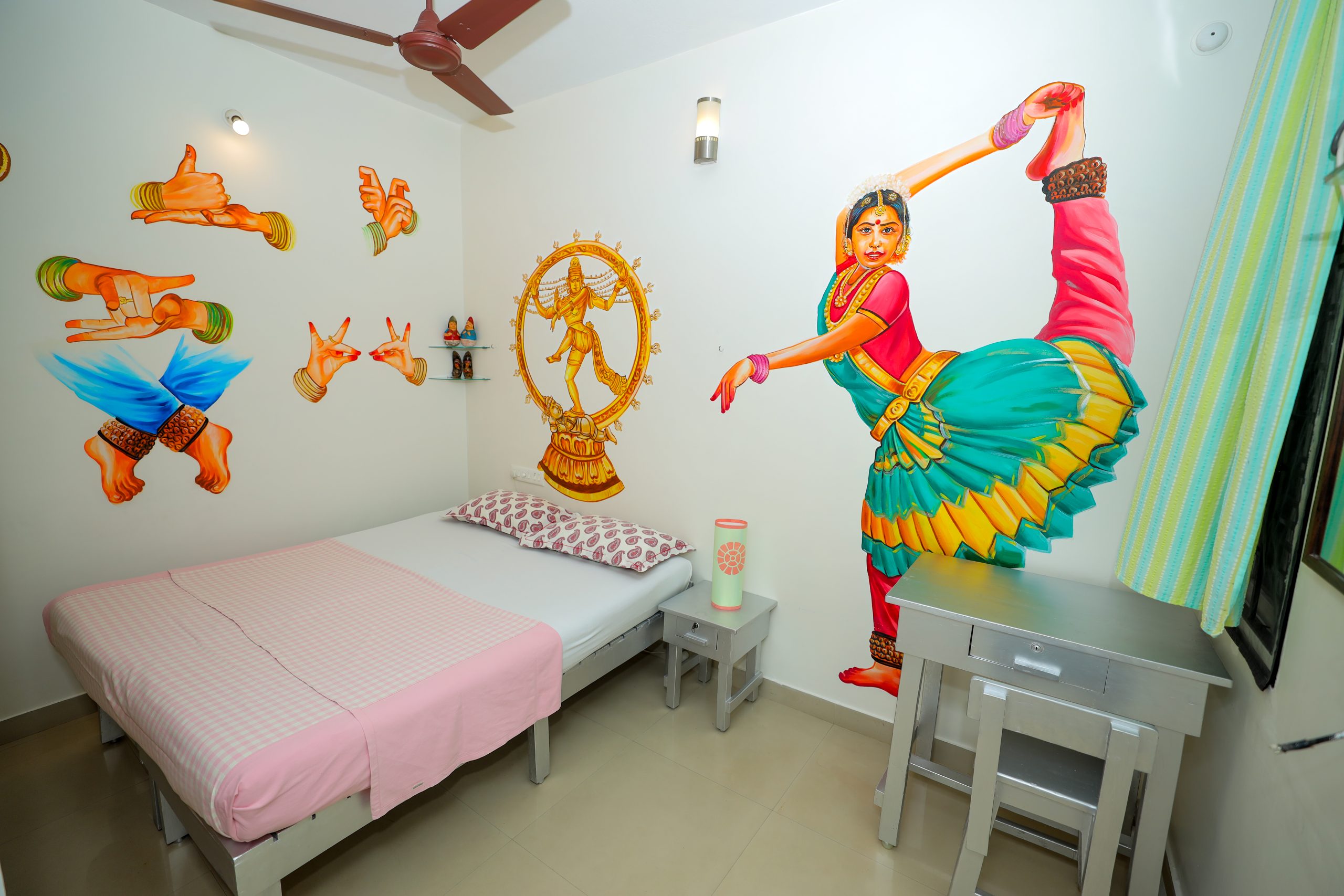 This room is situated on the first floor, conveniently near a charming swinging chair, perfect for relaxation. Adorning the wall is a captivating painting that depicts the traditional Tamil Nadu dance known as Bharatanatyam. The artwork beautifully illustrates a graceful girl dancing in front of Lord Nataraja, a revered deity in Indian culture. Surrounding her are intricate representations of various mudras, the hand gestures that are essential to the Bharatanatyam performance.