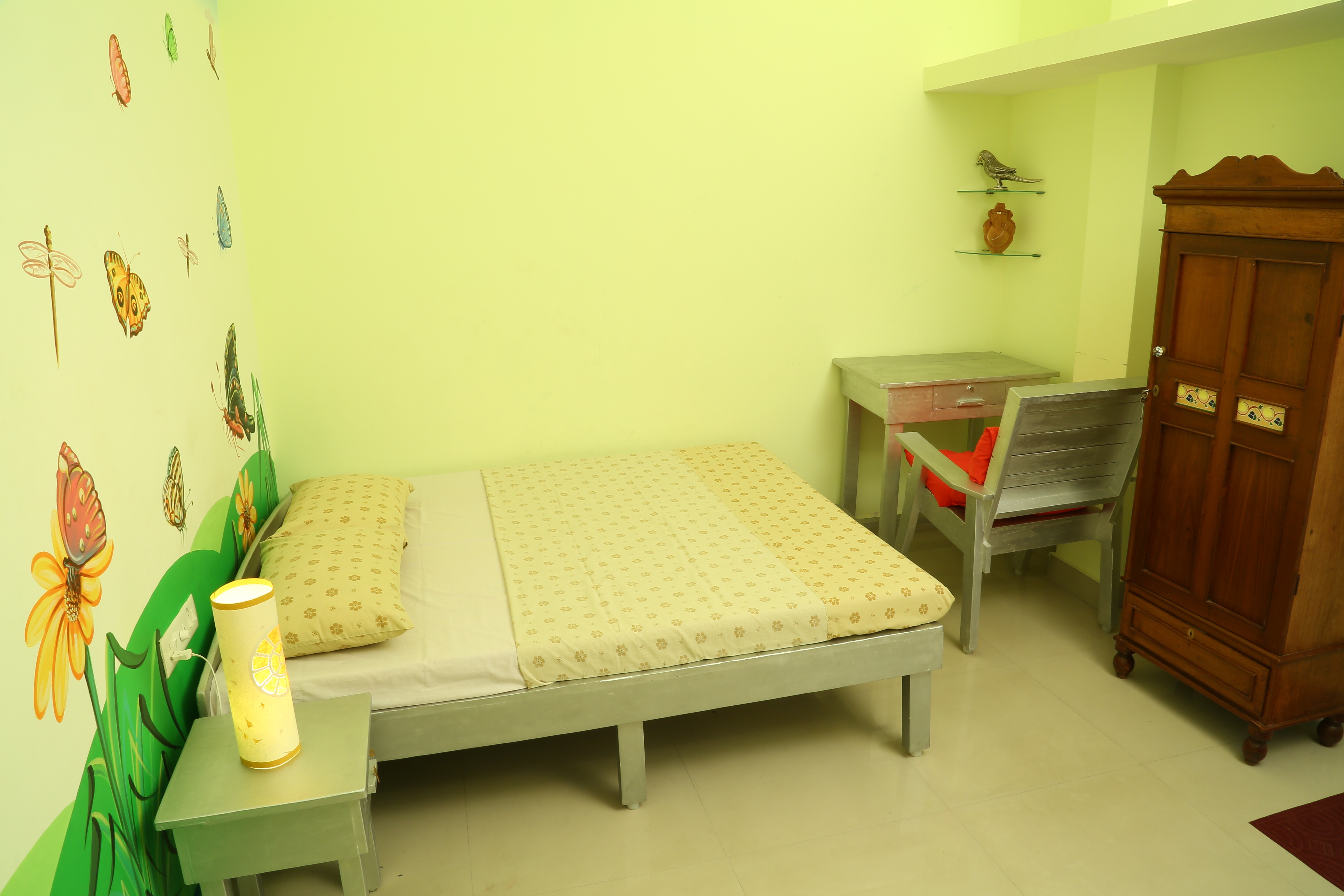 The Butterfly Room is situated on the second floor, featuring excellent ventilation that enhances its airy ambiance. Adorned with vibrant decor inspired by the myriad colors of butterflies, the room creates a joyful atmosphere that uplifts your spirits. Outside, a charming garden awaits, offering a peaceful retreat where you can relax and connect with nature. A heritage wooden sofa in the garden invites you to sit back and enjoy the serene surroundings. The bathroom is meticulously clean and regularly maintained, ensuring your comfort throughout your stay.