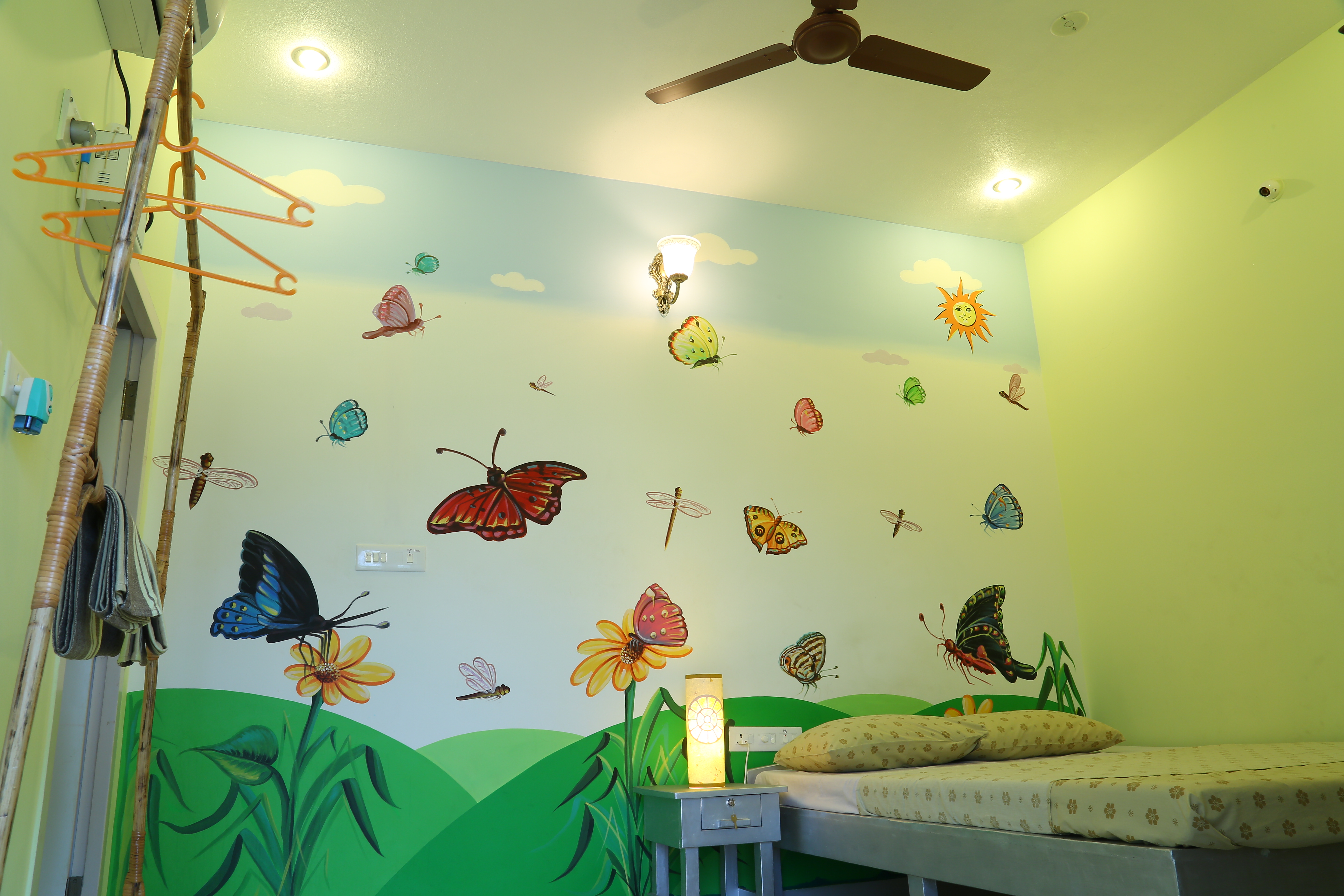 The Butterfly Room is situated on the second floor, featuring excellent ventilation that enhances its airy ambiance. Adorned with vibrant decor inspired by the myriad colors of butterflies, the room creates a joyful atmosphere that uplifts your spirits. Outside, a charming garden awaits, offering a peaceful retreat where you can relax and connect with nature. A heritage wooden sofa in the garden invites you to sit back and enjoy the serene surroundings. The bathroom is meticulously clean and regularly maintained, ensuring your comfort throughout your stay.