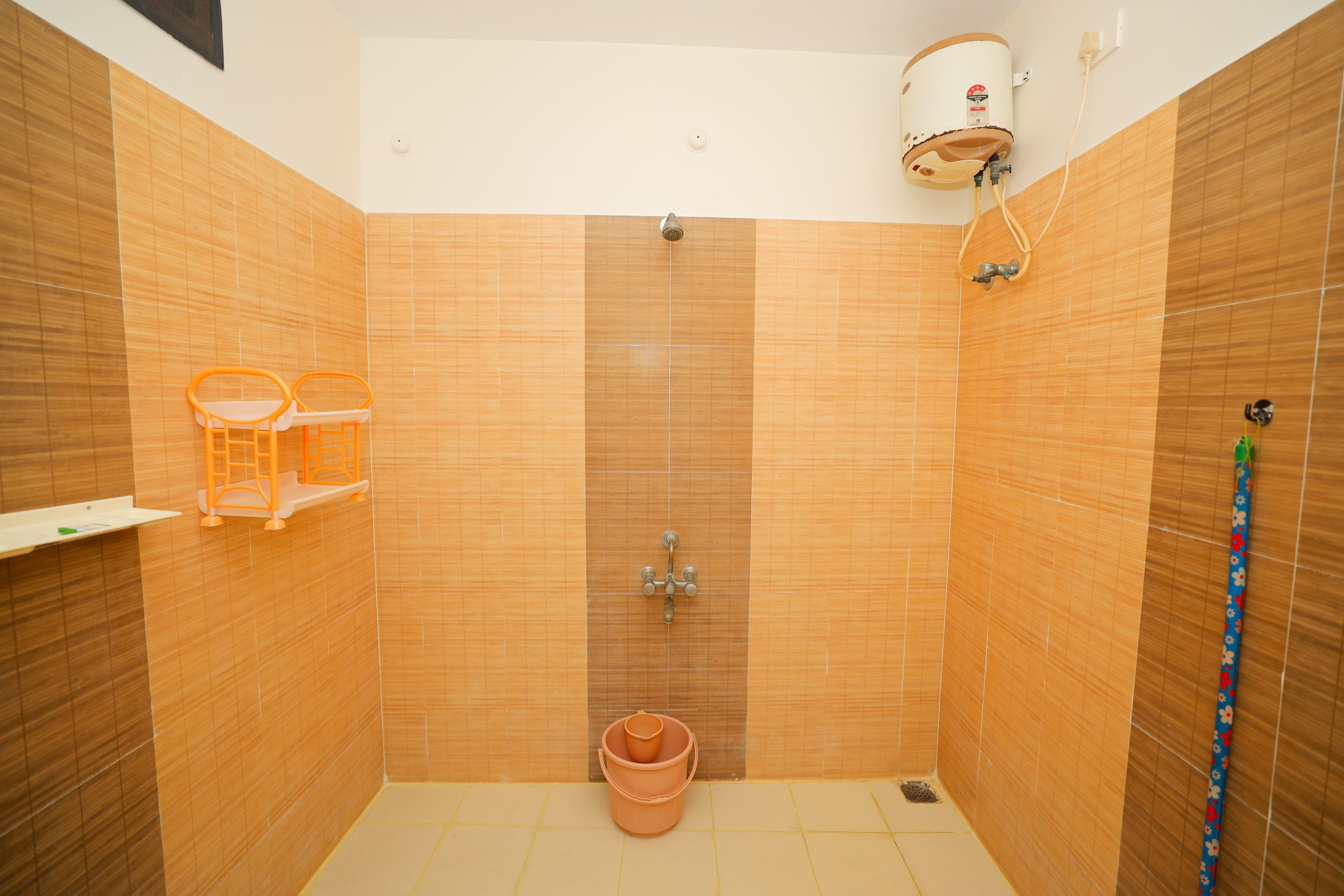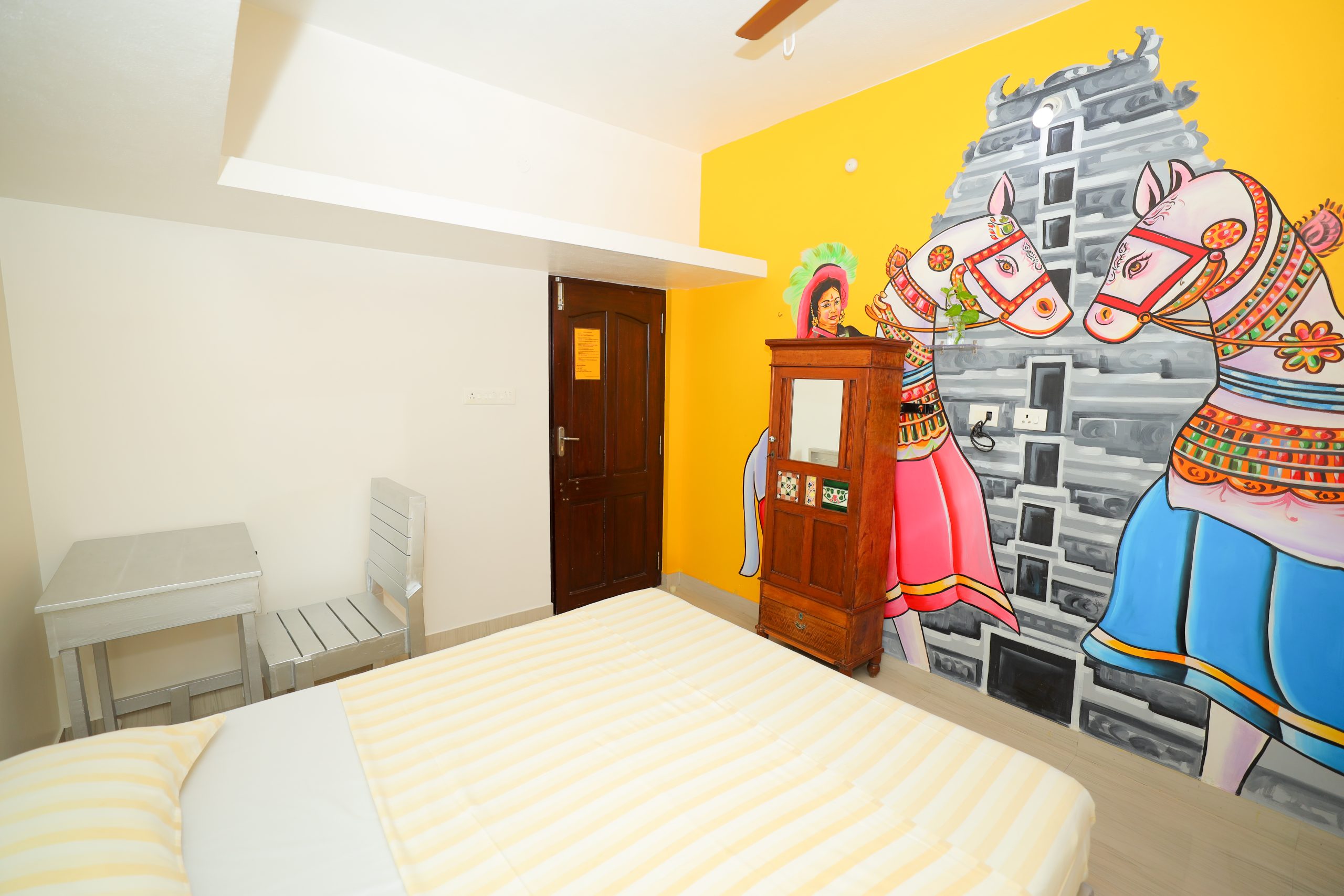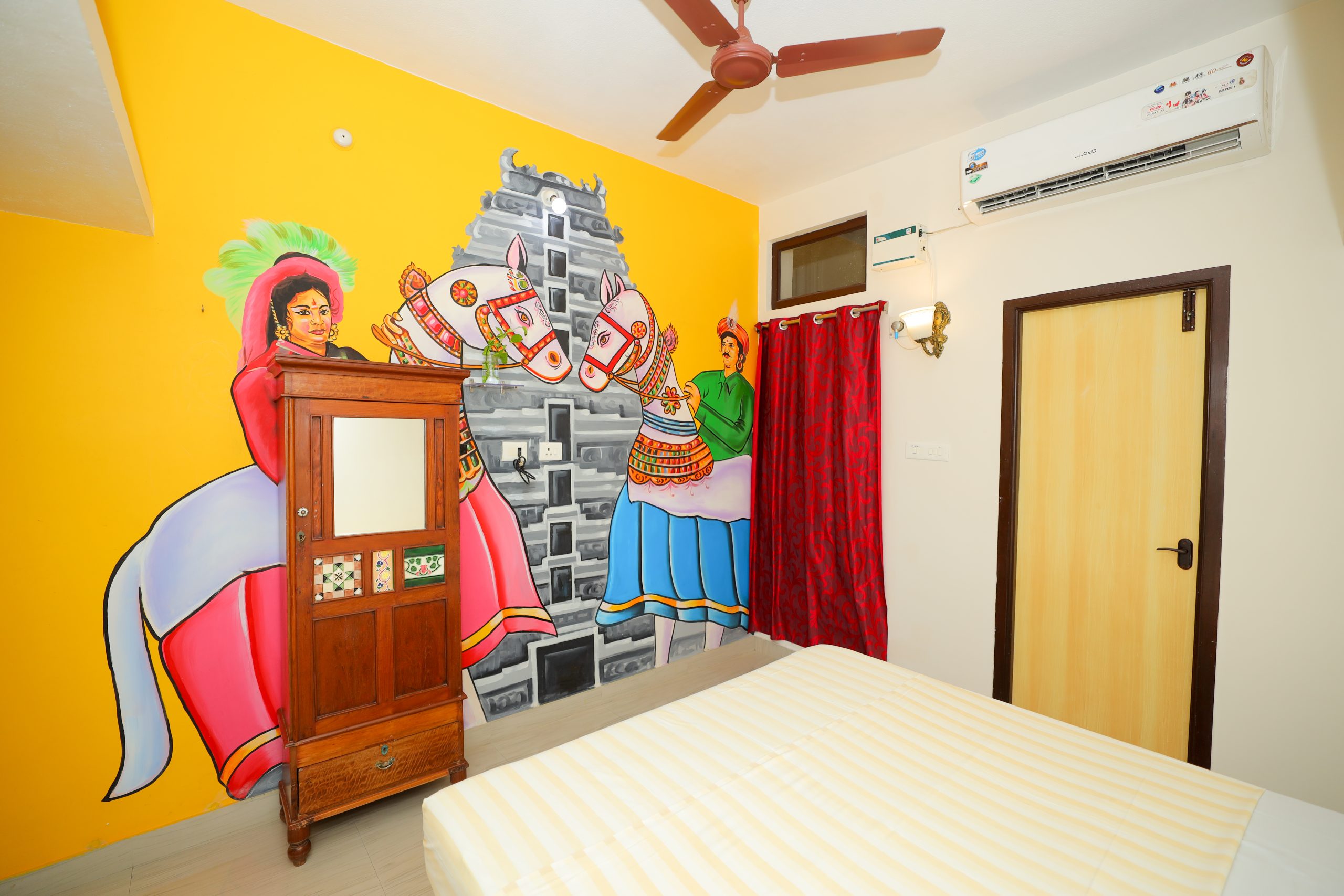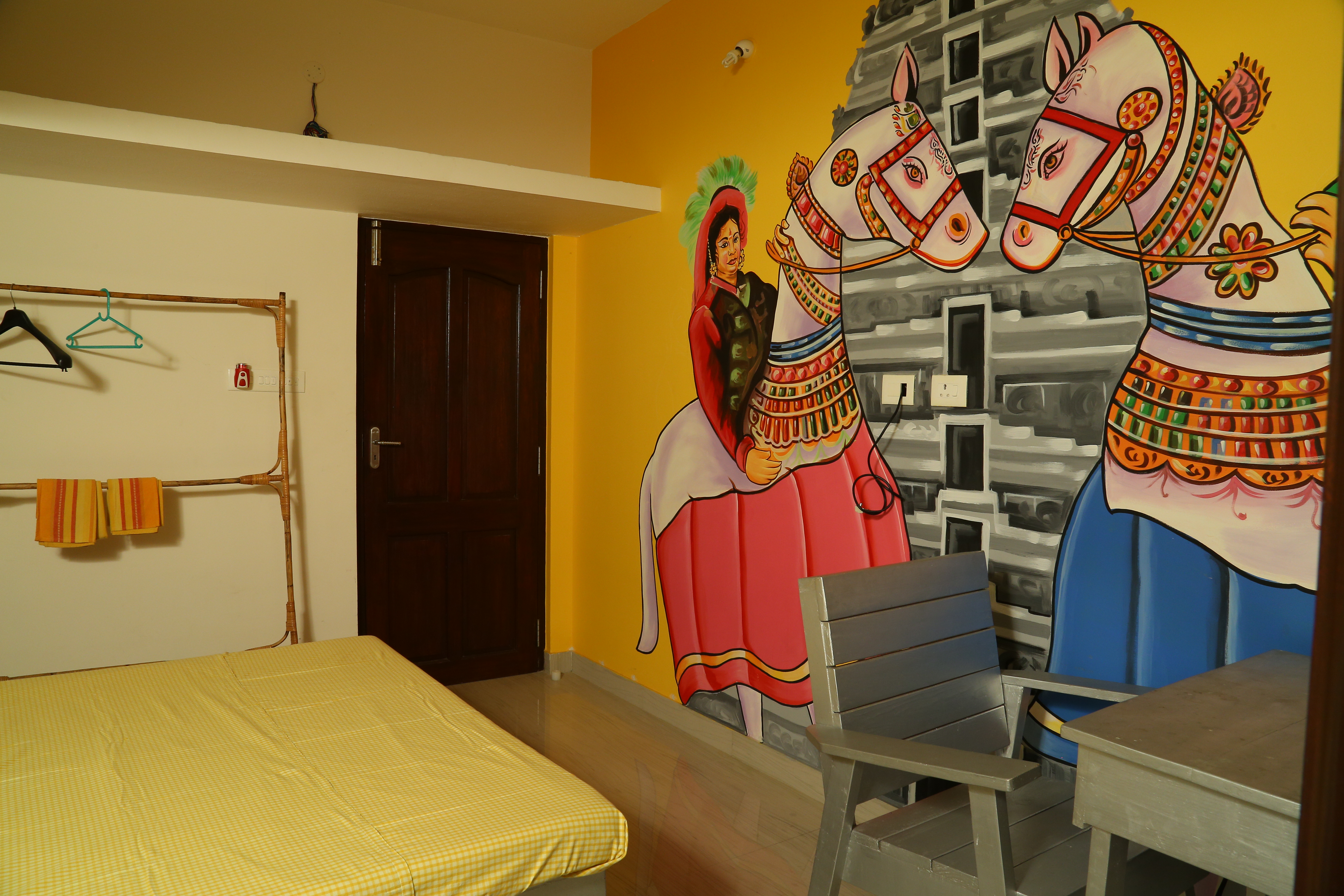 This room is located on the first floor, making it easy to access culinary amenities. A vibrant painting adorns the wall, celebrating traditional Indian culture with a depiction of a man and woman in horse costumes dancing with wooden legs. The excellent ventilation provides a refreshing atmosphere throughout your stay. Additionally, the spacious bathroom enhances your comfort, offering ample room to relax. With its cultural charm and thoughtful features, this room is designed for a memorable experience.