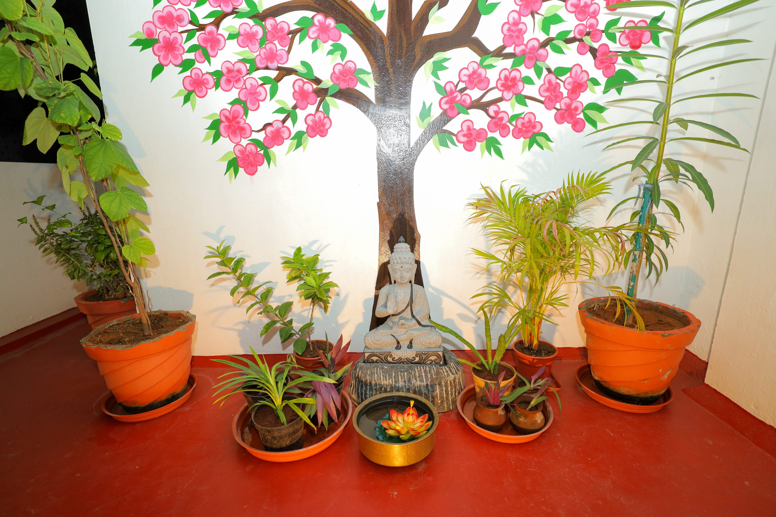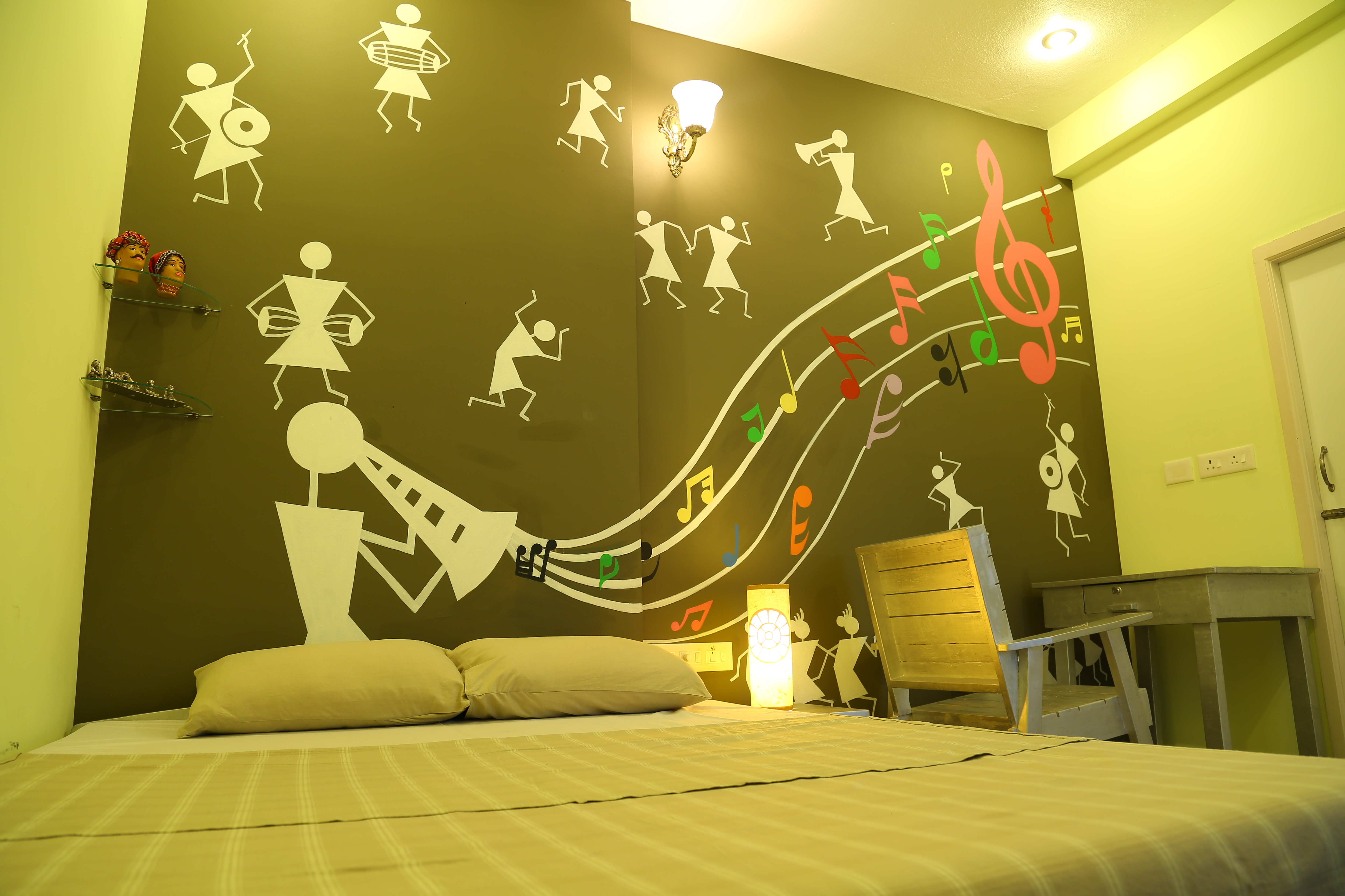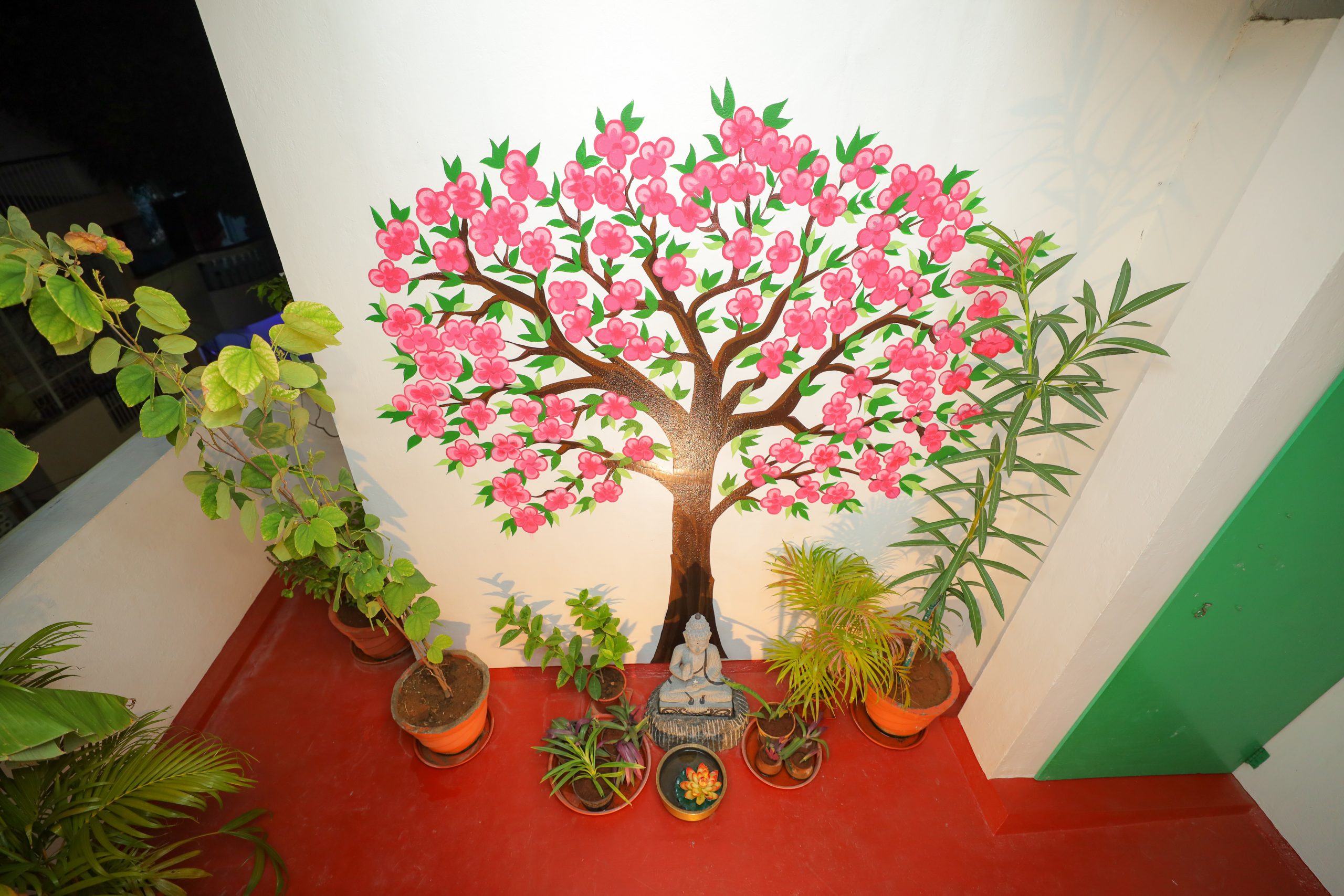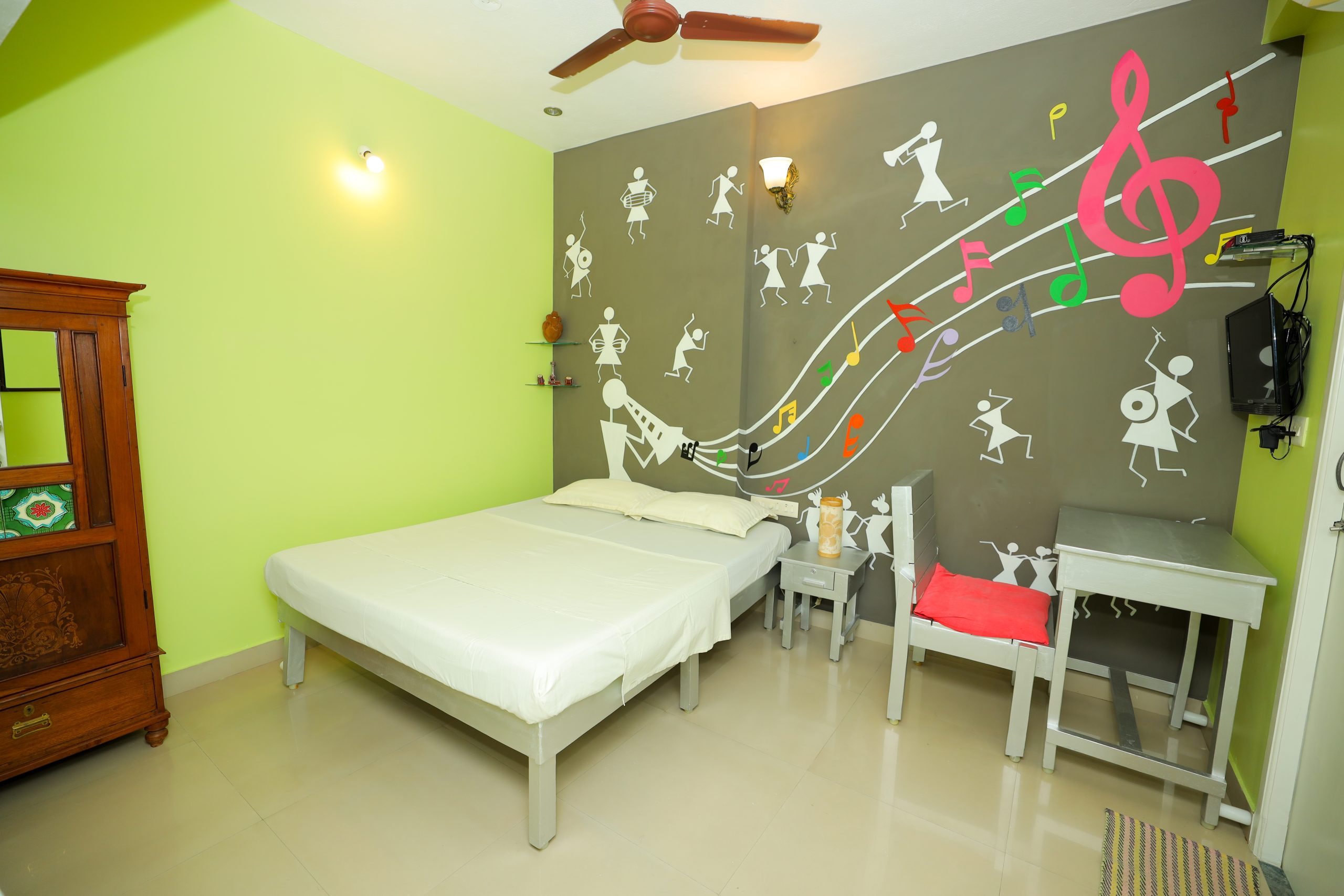 Our music room is situated on the terrace of the second floor, offering a serene space for relaxation and creativity. The walls are adorned with a vibrant painting that captures a tribal group dancing, singing, and playing various musical instruments, infusing the room with a warm and inviting atmosphere. Outside, a lovely garden awaits, providing a tranquil spot to unwind. You can enjoy the heritage wooden sofa in the garden, perfect for sitting back and soaking in the natural beauty. The bathroom in this room is meticulously clean and regularly maintained, ensuring a comfortable experience.