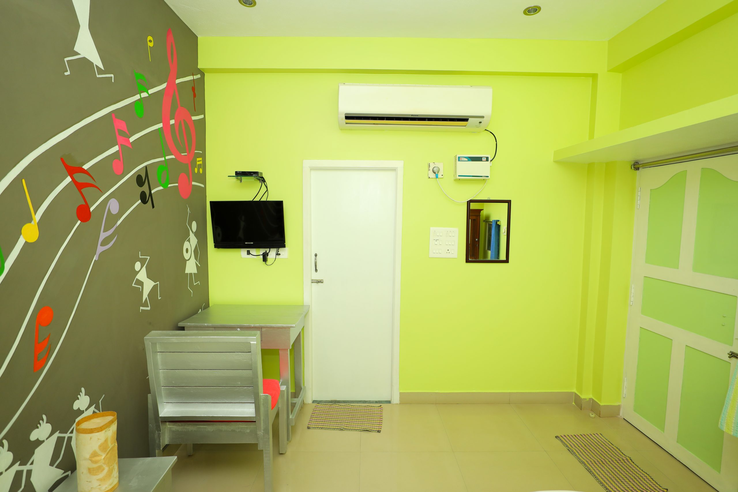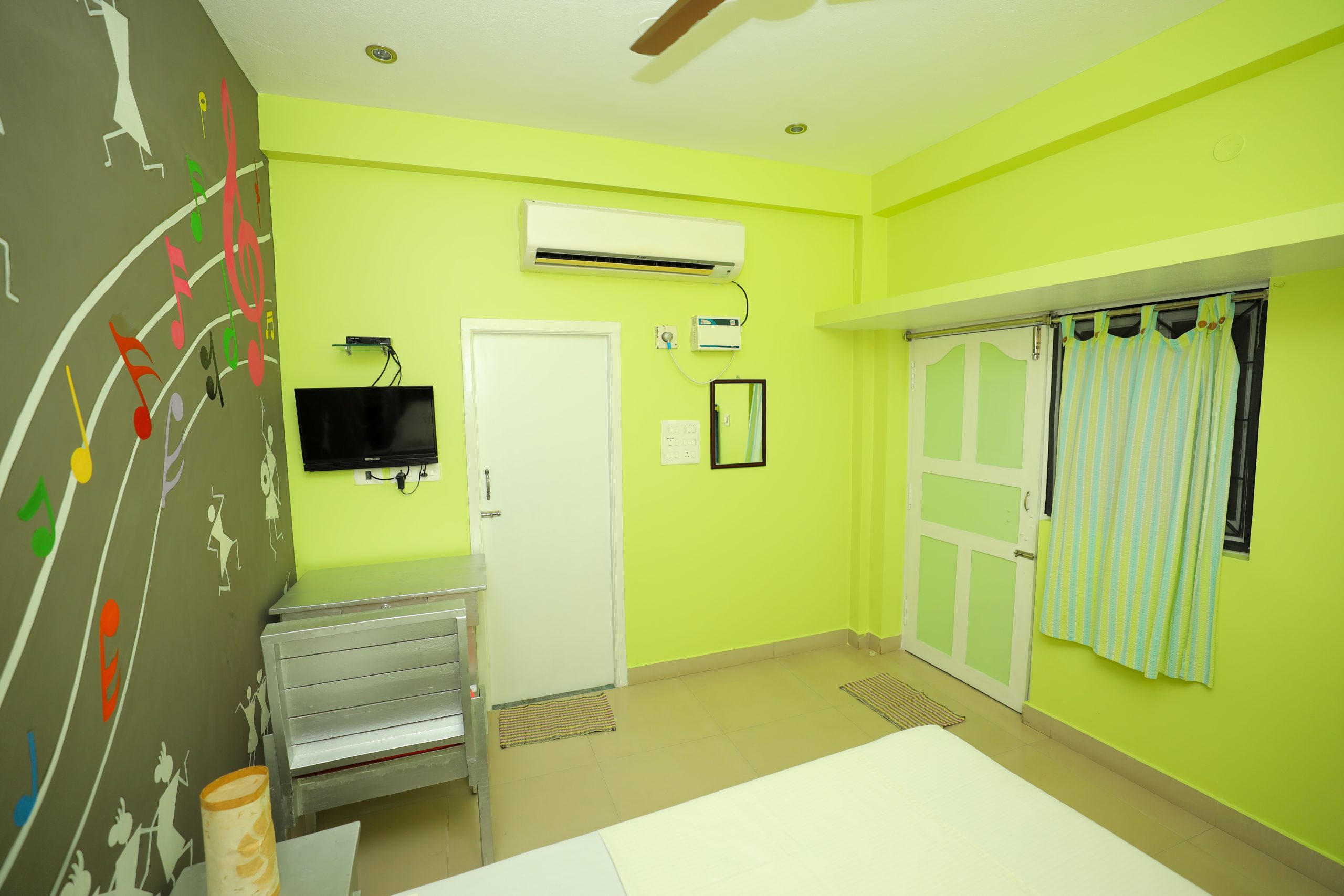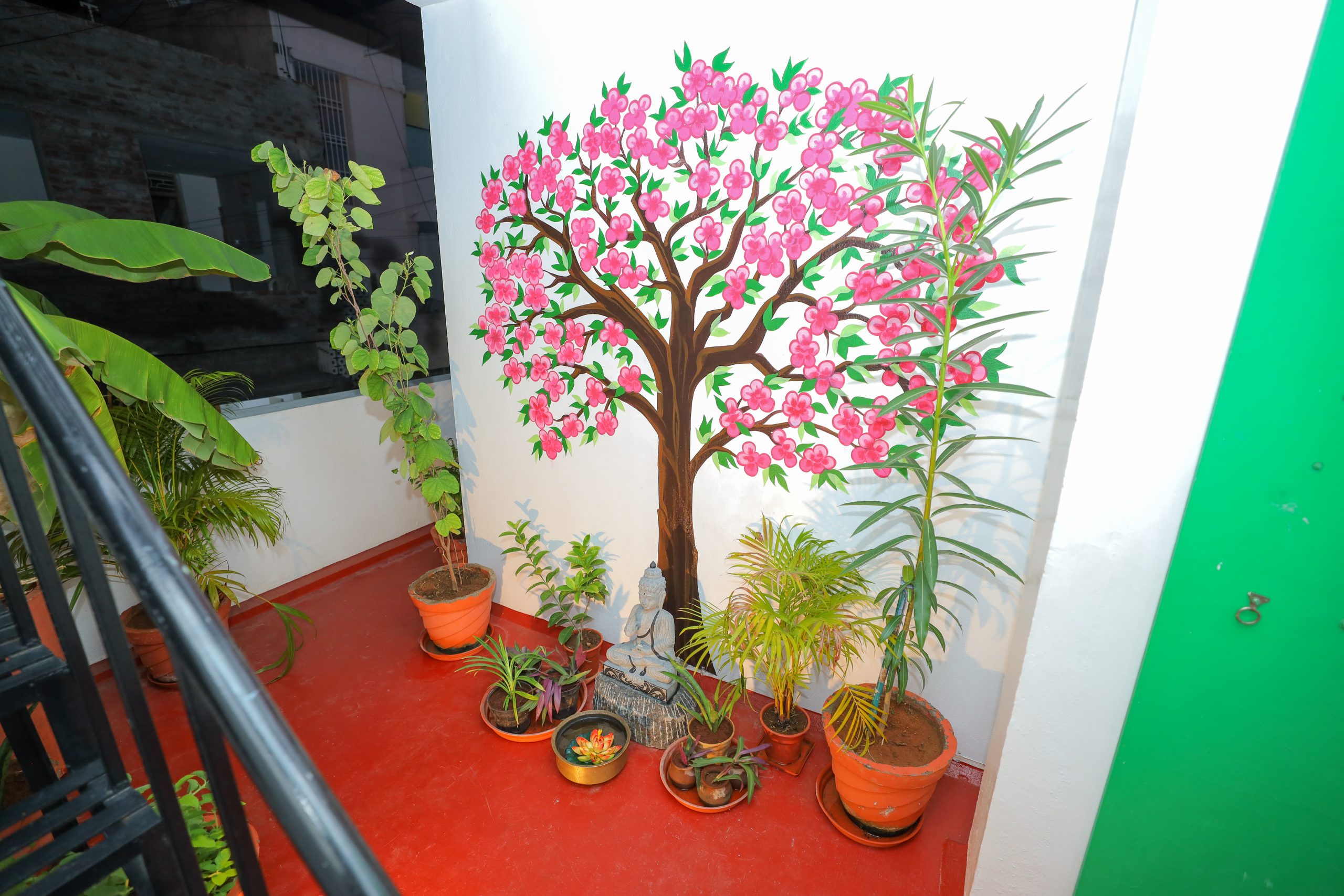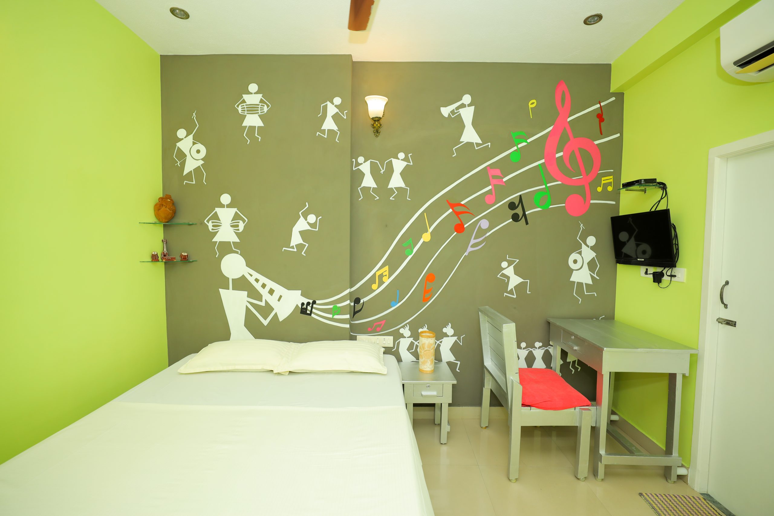 Our music room is situated on the terrace of the second floor, offering a serene space for relaxation and creativity. The walls are adorned with a vibrant painting that captures a tribal group dancing, singing, and playing various musical instruments, infusing the room with a warm and inviting atmosphere. Outside, a lovely garden awaits, providing a tranquil spot to unwind. You can enjoy the heritage wooden sofa in the garden, perfect for sitting back and soaking in the natural beauty. The bathroom in this room is meticulously clean and regularly maintained, ensuring a comfortable experience.