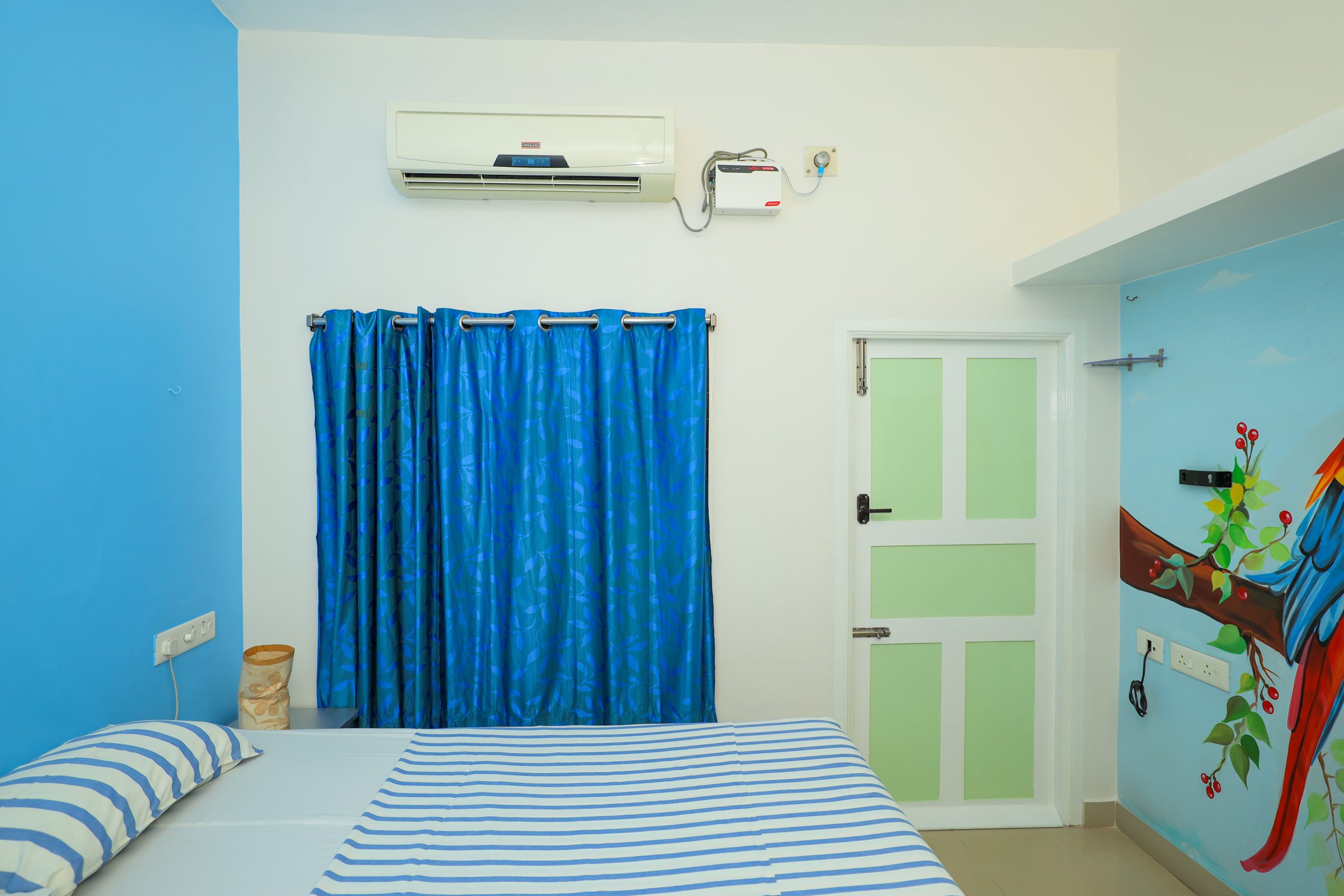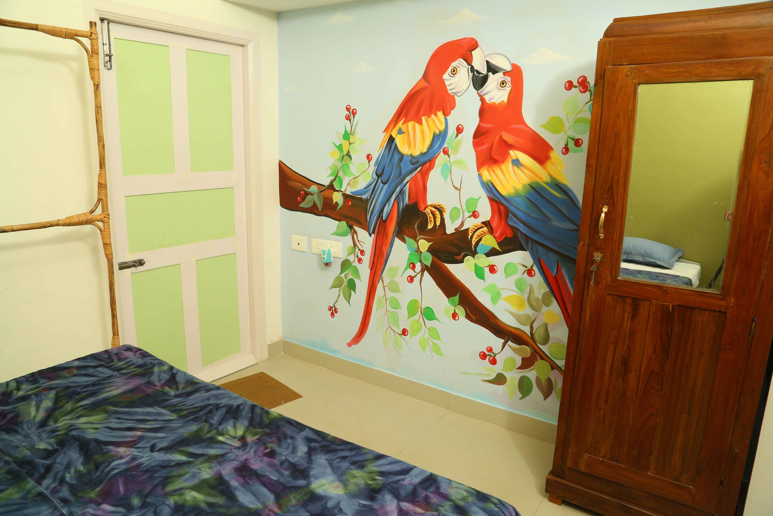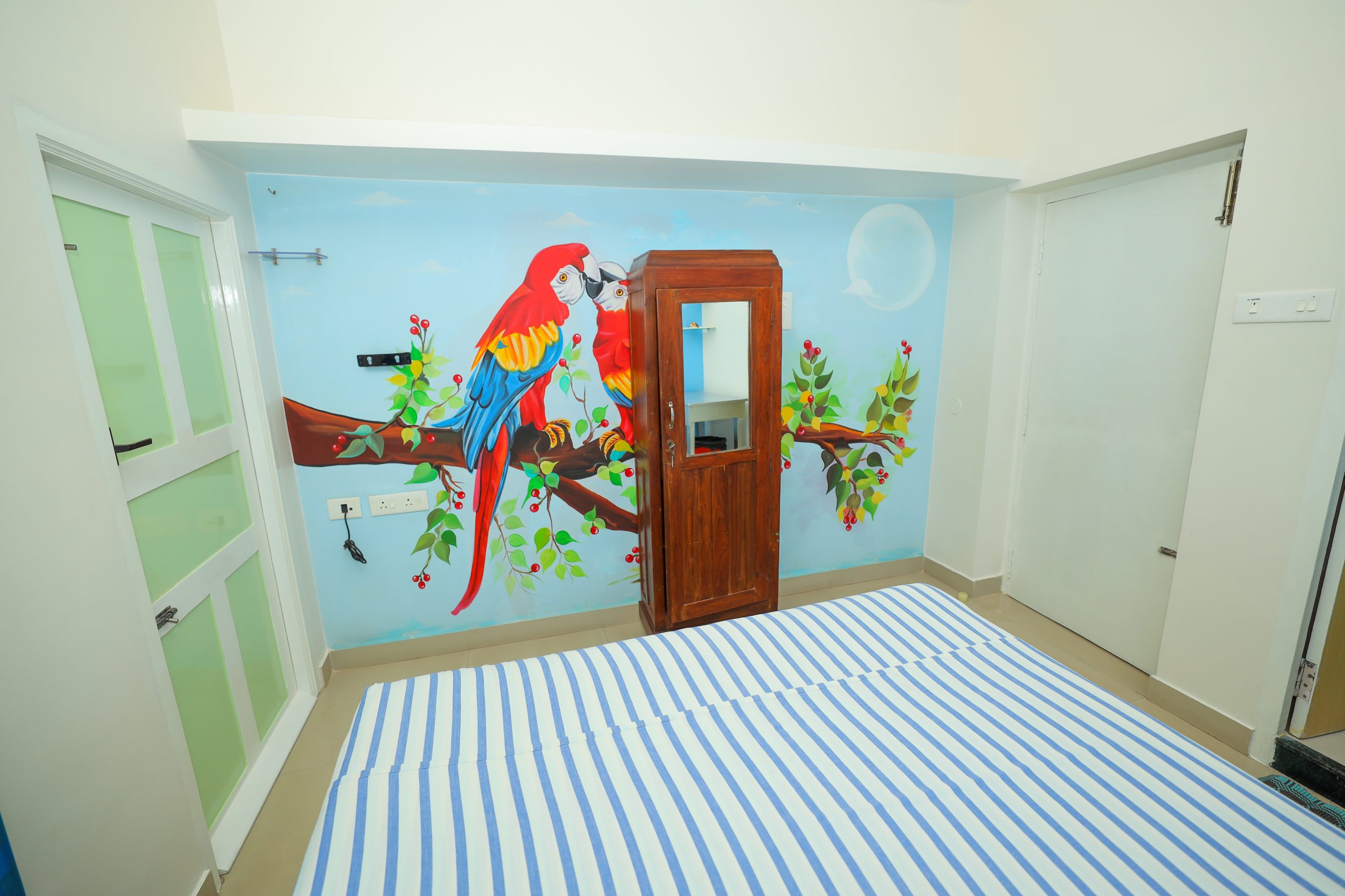 Nestled on the first floor, this charming room offers a delightful escape with its beautiful balcony overlooking the vibrant street below. The balcony invites you to bask in the fresh air while enjoying the sights and sounds of the neighborhood, making it a perfect spot for morning coffee or evening relaxation. As you step inside, you’ll be captivated by the enchanting painting of two colorful parrots tenderly exchanging affection. This exquisite artwork sets a romantic tone for the room, creating an atmosphere filled with warmth and intimacy.